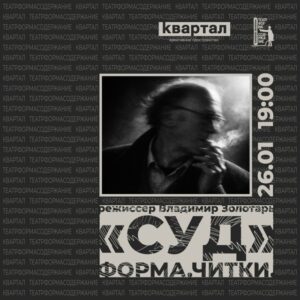 СУД Эскиз-читка пьесы «Суд» от лаборатории Театр.Форма.Содержание. Режиссёр: Владимир Золотарь Пьесу читают актёры: Максим Клюкин, Евгения Тимченко, Артём Петров. • 26 января, 19.00 Вход — свободные взносы! Количество мест ограничено, необходимо пройти предварительную регистрацию у Катерины Организатор: лаборатория Театр.Форма.Содержание. 18+ |
