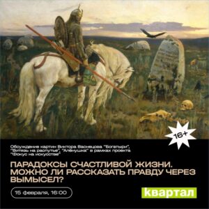 МОЖНО ЛИ РАССКАЗАТЬ ПРАВДУ ЧЕРЕЗ ВЫМЫСЕЛ? В креативном пространстве пройдёт обсуждение картин Виктора Васнецова «Богатыри», «Витязь на распутье», «Алёнушка» в рамках проекта «Фокус на искусстве» (t.me/focusartulsk). Виктор Михайлович Васнецов (1848-1926) — русский живописец и график, последователь «национального романтизма», один из наиболее знаменитых московских художников времён «контрреформ» и Серебряного века, архитектор и скульптор, общественник консервативных взглядов • 15 февраля, 16.00 Вход свободный! |