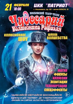 21 февраля 18:00 в ЦКК «Патриот» «ЧУДЕСАРИЙ» – музыкально-иллюзионный шоу-спектакль Московского Театра Чудес волшебника Рафаэля. В чудеса поверить трудно! Разгадать сложно! Пропустить невозможно! Приходи! Смотри! Участвуй! Обучайся! Удивляйся! Восхищайся! Мастера иллюзий поразят воображение и сотрут границы реальности! На уникальном шоу — представлении для всей семьи вас ждут: Не пропустите захватывающее представление, развлечение и обучение! Купить билет: ulcult.ru/announceme… Билеты можно приобрести на сайте ulcult.ru, в ЦКК «Патриот» (справки по телефону 38-42-12), в кассе Дворца «Губернаторский» (телефон кассы 44-11-56), в приложении Культура73. |