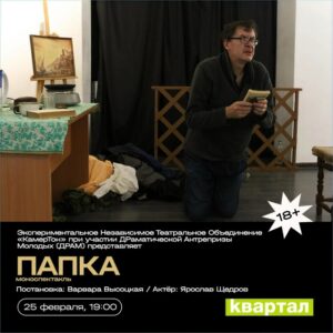 МОНОЛОГ В НИКУДА Экспериментальное Независимое Театральное Объединение «КамерТон» при участии ДРаматической Антрепризы Молодых (ДРАМ) представляет: ПЯТЫЙ ЮБИЛЕЙНЫЙ СЕЗОН Ярослав Щедров в МОНОСПЕКТАКЛЕ «ПАПКА» | 18+ В обычной городской квартире под «шелест» куриных лап начинается эта непростая исповедь Старика перед… собой. Кур держит хозяин квартиры. Поскольку больше в его жизни никого и ничего не осталось. Или ему только так кажется? Спектакль-эксперимент в формате 5D. В постановке Варвары ВЫСОЦКОЙ. В спектакле использованы произведения Вадима Егорова и музыка из фильма «АССА». ПРИ ПОДДЕРЖКЕ ДИМИТРОВГРАДСКОГО ДРАМАТИЧЕСКОГО ТЕАТРА ИМ. А. Н. ОСТРОВСКОГО. Отдельное спасибо: Илье Костинкину, Сергею Карачеву и Александру Зинину. Продолжительность постановки — 80 минут (без антракта). • 25 февраля, 19.00 Free donation. Если собираетесь прийти, пройдите регистрацию у Ярослава. Организатор: Экспериментальное Независимое Театральное Объединение «КамерТон» |