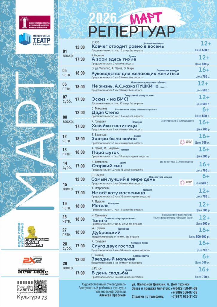 Купить билет можно любым удобным способом: ✅на нашем официальном сайте ul-mt.ru/ Режим работы кассы: тел. +79176293127 💳 ПУШКИНСКАЯ КАРТА действует на всех спектаклях! |