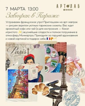 Завтрак в Париже: арт-утро по-французски 🥐☕️✨ Приглашаем на уютный арт-завтрак в стиле французского утра. Будем рисовать акрилом атмосферные парижские сюжеты 🥐 Вас ждут ароматный кофе или чай, а для лёгкости — бокал игристого. Увидимся 7 марта в 13:00 (суббота) Длительность: 2 часа СТОИМОСТЬ: Запись на мастер-класс осуществляется по предоплате 💫 СКИДКИ: Скидки не суммируются, предоставляется большая скидка! При оплате сертификатом, скидки не действуют Записаться на МК/связаться со школой: |