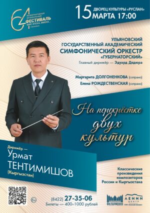 Урмат Тентимишов – главный дирижёр и художественный руководитель Большого симфонического оркестра мэрии города Бишкека, Отличник культуры, лауреат крупнейших международных конкурсов, в том числе Международного музыкального конкурса имени Д. Д. Шостаковича (Санкт-Петербург, 2025). В его творческом багаже –проекты самых разных жанров: классические симфонии и концерты, музыка кино, оперетта и мюзикл, популярные эстрадные программы. Урмат Тентимишов считается одним из ведущих молодых дирижёров страны, его успех неоднократно подтвердил высокий уровень кыргызской национальной дирижёрской школы.