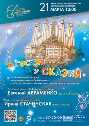 Титулярный органист Кафедрального собора Евгений Авраменко (орган, Калининград) Лауреат международных конкурсов, кандидат искусствоведения — Ирина Стачинская (флейта, Москва) Программу представляет кандидат искусствоведения Олеся Фиалко Героями музыкальной программы станут известные сказочные персонажи – Дюймовочка и Белоснежка, Оле-Лукойе и Щелкунчик. Оживут герои древнегреческих мифов нимфа Сиринкс, ставшая тростником, из которого Пан изготовил свою флейту, музыкант Орфей и его прекрасная Эвридика. Предстанут перед слушателями изящный Лебедь и нежный Подснежник… Все герои концерта – образы из музыкальных произведений известных композиторов Петра Чайковского, Николая Римского-Корсакова, Сергея Слонимского, Кристофа Виллибальда Глюка, Луиджи Боккерини и Камиля Сен-Санса. Большая музыка нарисует яркие и понятные юным меломанам образы и настроения, впуская в мир классического музыкального искусства ребят, только начинающих своё знакомство с серьёзной музыкой. В программе концерта – пьеса «Дюймовочка» современного российского классика Сергея Слонимского (р. 1932). Она входит в сборник фортепианных альбомов «От 5 до 50» – уникальных сборников, к пьесам которых интересно обращаться как юным музыкантам, так и зрелым мастерам. Хрупкая нежная мелодия этой пьесы рисует маленькую девочку, которая попадает в фантастическое приключение. Одному из номеров программы можно с полным правом дать титул «Самая популярная классическая музыка». Это Менуэт итальянского композитора Луиджи Боккерини, созданный в конце XVIII века. Являясь одним из частей Струнного квартета, Менуэт получил широкую популярность в XX веке, став символом элегантности и утончённости прошлых эпох. Ещё одно любопытное произведение концерта – Мелодия из оперы «Орфей и Эвридика» Кристофа Виллибальда Глюка. Нежная, печальная мелодия считается одной из самых прекрасных в классической музыке. Орфей потерял свою возлюбленную Эвридику и идёт в царство мёртвых, чтобы вернуть её. Встретив любимую, Орфей играет на флейте, выразив в мелодии веру в счастье и возвращение любимой к жизни. Во время концерта юные слушатели познакомятся с двумя музыкальными инструментами – флейтой и органом. Их можно назвать близкими родственниками по духовой линии. В программе: Сергей Слонимский. «Дюймовочка» из фортепианного альбома «От пяти до пятидесяти» Жанэтта Металлиди. Сюита «Золотой ключик», «Колыбельная Оле-Лукойе» Пётр Чайковский. Марш из балета «Щелкунчик». «Подснежник» и «Баркарола» из цикла «Времена года» Николай Римский-Корсаков. Песня индийского гостя из оперы «Садко» Камиль Сен-Санс. «Лебедь» из сюиты «Карнавал животных» Луиджи Боккерини. Менуэт Клод Дебюсси. «Сиринкс» Кристоф Виллибальд Глюк. Танец духов и Мелодия из оперы «Орфей и Эвридика» Фрэнк Черчиль. Песня Белоснежки «Когда придёт мой принц» из мультфильма «Белоснежка и семь гномов» Билеты — 400 рублей* *Дети до трёх лет бесплатно без отдельного места |