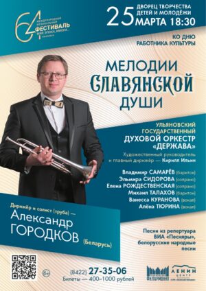 Ульяновский государственный духовой оркестр «Держава» Художественный руководитель и главный дирижёр – Кирилл Ильин Дирижёр – художественный руководитель и дирижёр Могилевского городского духового оркестра Александр Городков (Беларусь) Заслуженный работник культуры Ульяновской области Владимир Самарёв (баритон) Эльмира Сидорова (сопрано) Елена Рождественская (сопрано) Михаил Талахов (баритон) Алёна Тюрина (вокал) Ванесса Куранова (вокал) Программу представляет заслуженный работник культуры России Лариса Куфтина Ежегодно 2 апреля отмечается День единения народов России и Белоруссии. Именно в этот день был подписан Договор о Союзе Беларуси и России. Наши страны неизменно укрепляют этот союз, мы связаны общей культурой и историей. Основными целями создания Союза было укрепление братства, дружбы и сотрудничества в политической, экономической и культурной сферах. Активно развиваются гуманитарные связи между учреждениями культуры, проводятся торжественные мероприятия, праздничные концерты, в которых выступают ведущие исполнители и коллективы из двух стран. 25 марта во Дворце творчества детей и молодёжи состоится знаковый концерт. Вместе с государственным духовым оркестром «Держава» выступит дирижёр и солист из Беларуси Александр Городков, который представит свою страну на 64-м Международном музыкальном фестивале «Мир, Эпоха, Имена…» Александр Николаевич Городков в 2003 году окончил Белорусскую государственную академию музыки. С марта 2014 года является директором – художественным руководителем государственного учреждения культуры «Могилёвские городские оркестры». Лауреат республиканских и международных конкурсов, обладатель гранда Президента Республики Беларусь в области культуры, лауреат специальной премии Могилевского областного исполнительного комитета в социальной сфере, лауреат специальной премии «Достижение» Могилевского горисполкома в номинации «Культура». Как руководитель и дирижёр пропагандирует отечественную и зарубежную музыку. В фестивальной программе прозвучит музыка Беларуси – народные песни в современных обработках, песни из репертуара ВИА «Песняры», «Верасы», которые так полюбились советским меломанам, а также любимые песни Александры Пахмутовой, Юрия Антонова, Игоря Лученка, Петра Андреева. Крепнет и развивается плодотворное сотрудничество между Россией и Беларусью, между музыкантами Ульяновска, Минска и Могилёва. Этот концерт в рамках фестиваля «Мир, Эпоха, Имена…» станет яркой страницей в истории братской дружбы народов Беларуси и России. В программе: Л. Карпенко. Попурри на темы ВИА «Песняры» «Белая Русь» Г. Богомолов. Концертный марш «Могилёв» А. Дурбин. Фрейлекс Е. Глебов. «Клоунада» А. Пахмутова. «Белоруссия» А. Трайкович. Попурри «Дефиле» М. Бублик. «Будет светло» О. Аверин. «Бялявая, чарнявая» И. Лученко. «Верасы» В. Шмат, С. Шмат. «За нами правда» из репертуара арт-группы «Беларусы» И. Лученок. «Зачарованная моя» В. Мулявин. «Каляда» из репертуара ВИА «Песняры» П. Андреев. «Матушка земля» О. Молчан. «Молитва» из репертуара ВИА «Песняры» П. Елфимов. «Сонца каласы» В. Мулявин. Чырвоная ружа Белорусская народная песня «Косил Ясь конюшину» Билеты — 400-1000 рублей |