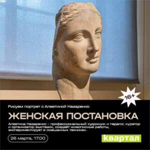 ПОРТРЕТ. ЖЕНСКАЯ ПОСТАНОВКА Рисуем портрет с Алевтиной Назаренко. Алевтина Назаренко — профессиональный художник и педагог, куратор и организатор выставок, создаёт живописные работы, экспериментирует в смешанных техниках. Участница городских, областных, российских и международных выставок. В копилке Алевтины несколько персональных выставок. Мастер быстрого портрета с натуры. Материалы приносите с собой. Мольберты предоставляются. • 26 марта, 17:00 Регистрация и подробности у мастера. Организатор: Алевтина Назаренко |