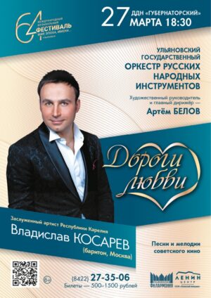 Ульяновский государственный оркестр русских народных инструментов Художественный руководитель и главный дирижёр — Артём Белов Солист — заслуженный артист Республики Карелия Владислав Косарев (баритон, Москва) Программу представляет Элла Якубенкова Талант и любовь к музыке создают подлинные шедевры, которые с течением времени не только не устаревают, напротив, изумляют совершенством и красотой. В программе концерта прозвучат любимые мелодии, согревающие душу, наполняющие сердце радостью и восторгом. Гость фестиваля –полюбившийся ульяновской публике певец Владислав Косарев. Владислав Косарев – чрезвычайно талантливый певец, обладающий глубоким и насыщенным баритоном. По окончании Российской академии музыки им. Гнесиных восемь лет работал в мужском хоре «Пересвет», где был сначала солистом, а затем и главным дирижёром.
