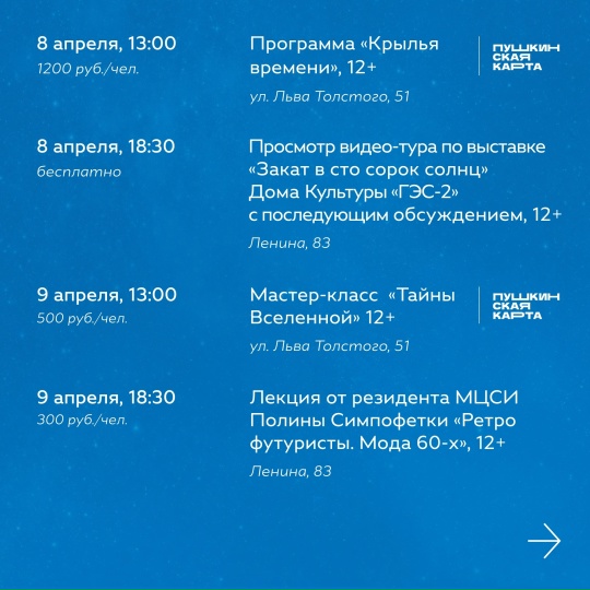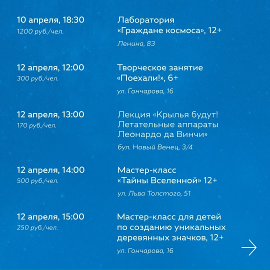 День космонавтики с Ульяновским областным художественным музеем! Подготовили для вас ряд событий, посвященных дню космонавтики. Выбирайте понравившееся событие и приходите к нам. 8 апреля, 13:00 Программа «Крылья времени» 12+ В программе представлены древнейшие изображения летящего человека на небо; рисунки летательного аппарата Леонардо да Винчи; полеты на воздушном шаре в произведениях мирового искусства; дирижабли, самолëты, гидропланы в искусстве ХХ века. В программе особое внимание уделено теме космоса и лётчикам-космонавтам. Продолжением станет арт-практикум по изготовлению часов с изображением самолёта. Билеты: www.afisha.ru/wl/611/api… 8 апреля, 18:30 Просмотр видео-тура по выставке «Закат в сто сорок солнц» Дома Культуры «ГЭС-2» с последующим обсуждением 12+ Выставка о космических мечтаниях и разочарованиях от начала XX века до наших дней, эпохе всеобщего упоения космосом и ее отображении в советском искусстве. 9 апреля, 13:00 и 12 апреля, 14:00 Мастер-класс «Тайны Вселенной» 12+ Всем полюбившийся мастер-класс по созданию эксклюзивного брелока «Тайны Вселенной». Почувствуйте себя создателем собственной галактики, воплощая безграничную красоту звездного неба в изящном аксессуаре. Билеты: uohm.art/2026/04/03… 9 апреля, 18:30 Лекция от резидента МЦСИ Полины Симпофетки «Ретро футуристы. Мода 60-х» 12+ 60-е годы 20го века — не просто время первых полётов в космос. Это десятилетие, в которое космическая тема стала буквально лейтмотивом творчества, главным вдохновением деятелей искусства. Сферу моды также захватила волна футуризма. Как на модную арену вышли такие имена как Пако Рабан, Пьер Карден, Андре Курреж и Мэри Куант? Что общего между эскимосами, путешествием в будущее и модой? Ответы на эти и многие другие любопытные вопросы даст на своей лекции стилист и преподаватель истории моды Полина Симпофетка. Билеты: www.afisha.ru/wl/611/api… 10 апреля, 18:30 Лаборатория «Граждане космоса» 12+ На основе сборника текстов «Граждане космоса: русский космизм в фильмах Антона Видокле» пройдёт лаборатория в контексте современной философии и искусства. 12 апреля, 12:00 Творческое занятие «Поехали!» 6+ Это интерактивный формат, включающий рассказ о Юрии Гагарине, создание тушью портрета первого космонавта в мире. Занятие направлено на знакомство с историей космонавтики, развитие фантазии и воспитание гордости за отечественные достижения. 12 апреля, 15:00 Мастер-класс для детей по созданию уникальных деревянных значков 12+ Мастер-класс включает знакомство с материалами, роспись акрилом и покрытие лаком. Развитие творческих способностей, мелкой моторики и получение новых навыков гарантированы. Каждый участник унесет с собой оригинальный значок. 12 апреля, 13:00 Лекция «Крылья будут! Летательные аппараты Леонардо да Винчи» 12+ Леонардо да Винчи — художник, соединивший в себе мощь инженерной мысли и виртуозное художественное дарование. Настоящая слава пришла к нему спустя века: лишь в конце XIX века были впервые опубликованы его теоретические записи — те самые, где скрывались чертежи странных, опережающих время аппаратов.