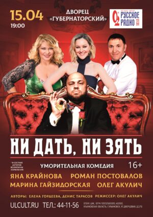 Впервые звёзды легендарного юмористического шоу с канала СТС сыграют не в короткой комедийной зарисовке, а в большой театральной комедии «Ни дать, ни зять!» вместе с известными актёрами московских театров. По вопросам о билетах, купленных не в кассах Дворца «Губернаторский», обращаться в места приобретения