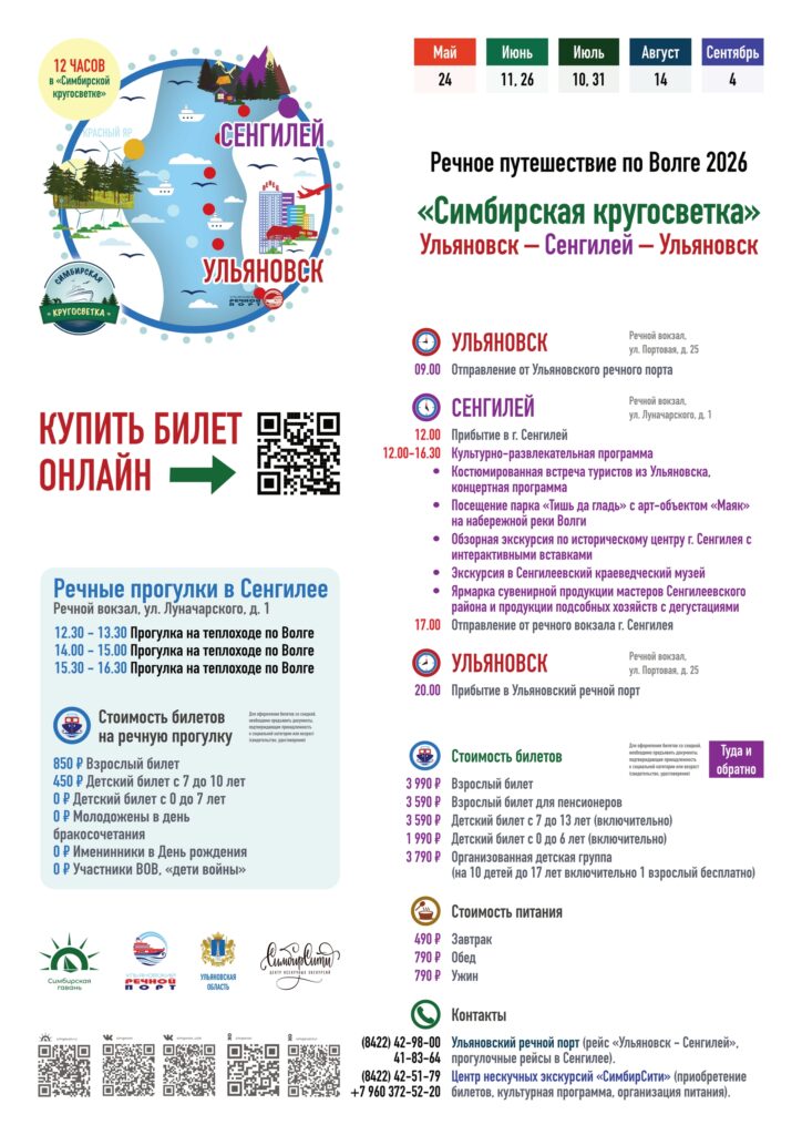 (8422) 42-98-00, 41-83-64 – Ульяновский речной порт (речное путешествие «Ульяновск – Сенгилей – Ульяновск», прогулочные рейсы в Сенгилее);