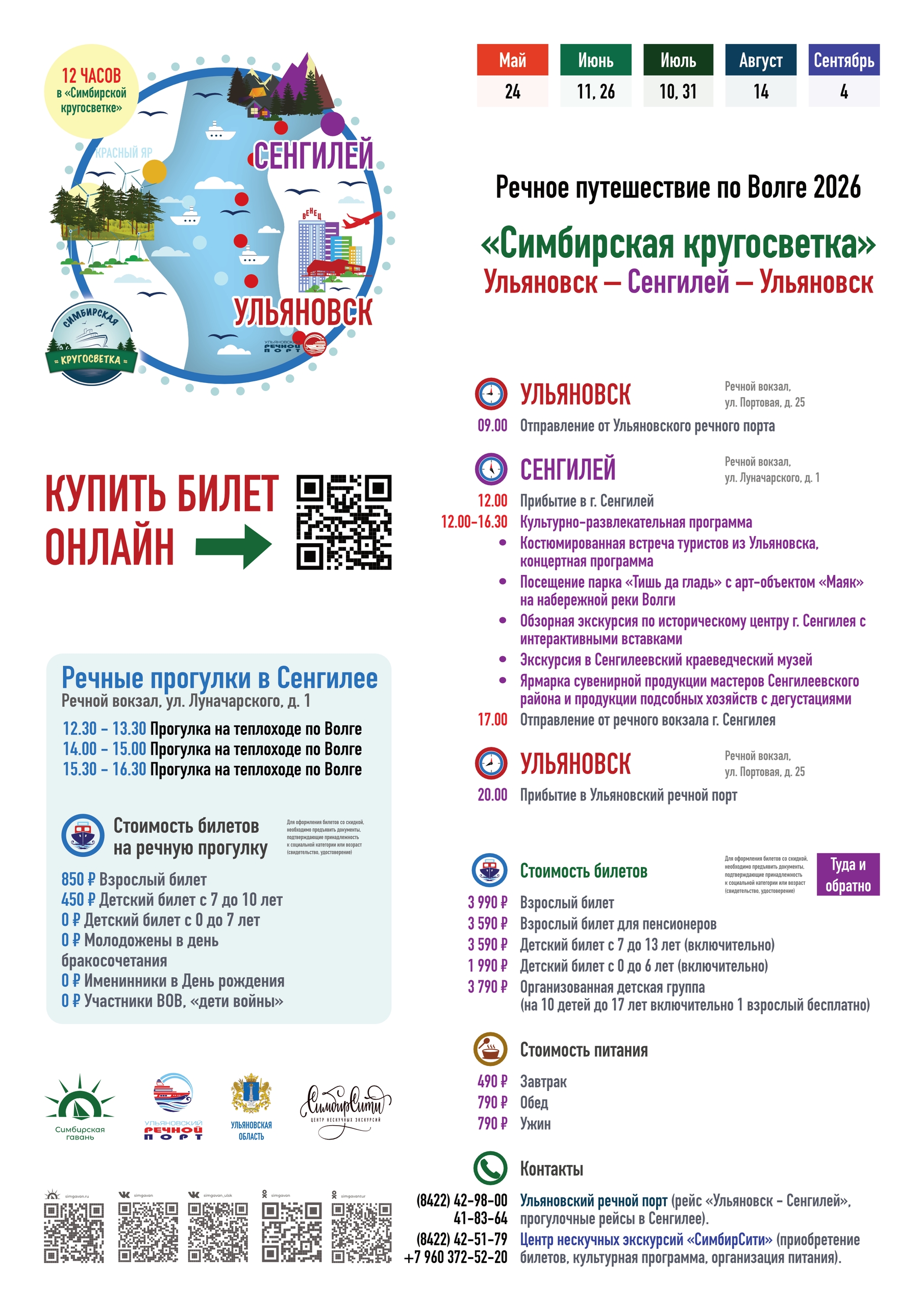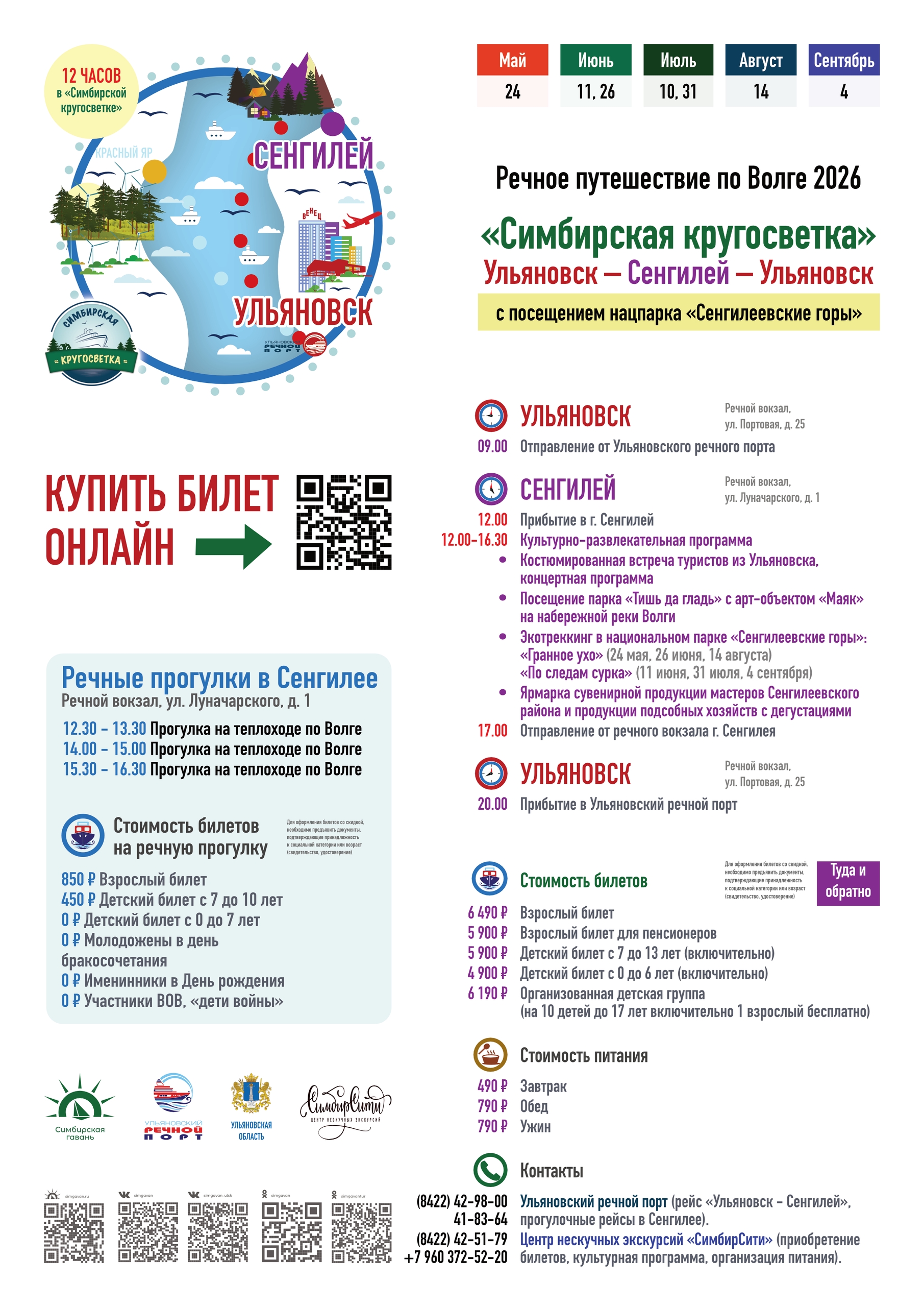 Первый тур «Симбирской кругосветки» по маршруту «Ульяновск – Сенгилей –Ульяновск» от причала Ульяновского речного порта стартует 24 мая. Туристов ждут две культурно-развлекательных программы на выбор – экскурсии по достопримечательностям «блинной столицы» и экотреккинг в национальном парке «Сенгилеевские горы». Для жителей Сенгилея традиционно состоятся речные прогулки на теплоходе «Московский».