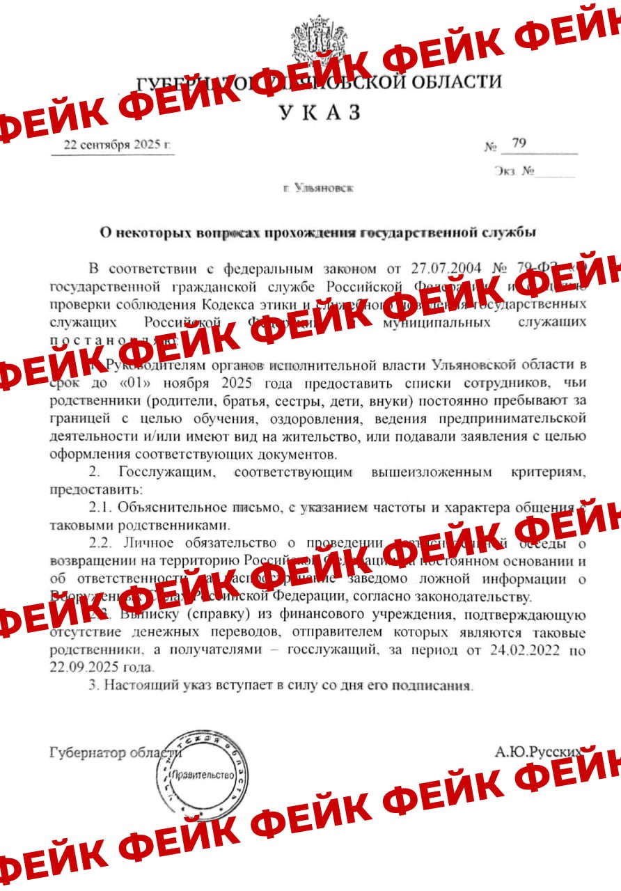 Центр управления регионом (ЦУР) Ульяновской области зафиксировал и предотвратил распространение поддельного указа губернатора, который предписывал собрать списки государственных служащих, чьи родственники постоянно проживают за границей.